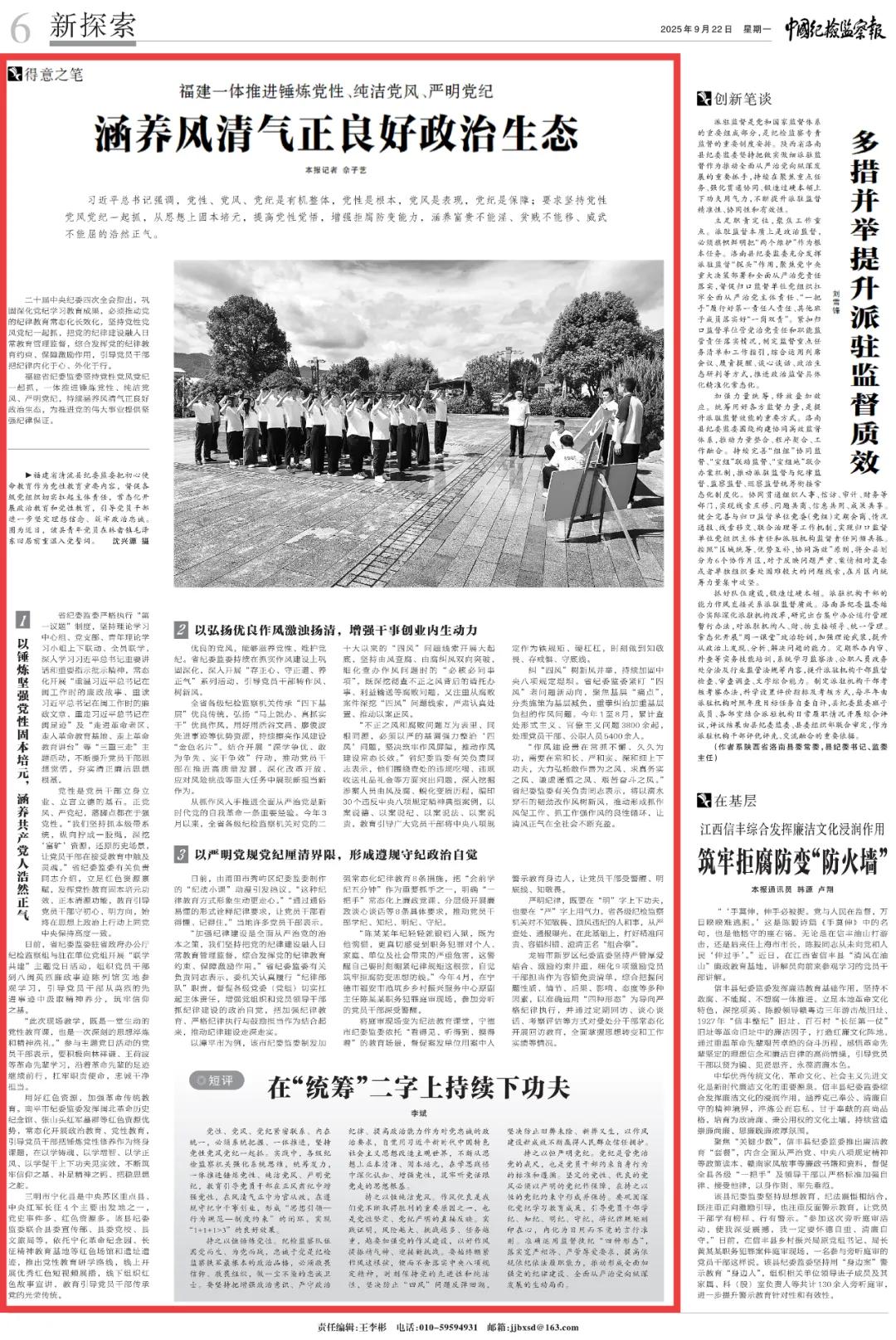 9月22日《中國紀檢監察報》“新探索”版刊發了福建一體推進錘煉黨性、純潔黨風、嚴明黨紀,涵養風清氣正良好政治生態的經驗做法