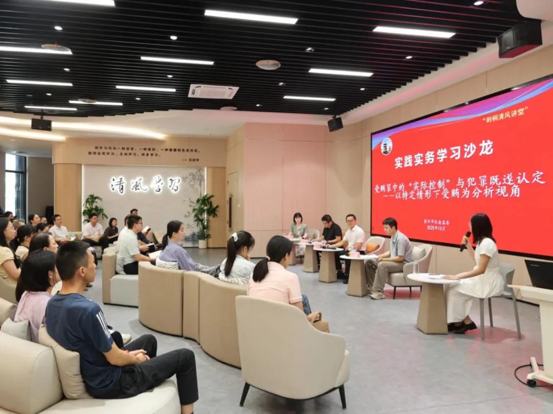為進一步提升職務犯罪案件辦理質效和紀檢監察干部業務能力,近日,市紀委監委、洛江區紀委監委聚焦實踐實務中碰到的重點、難點和紀檢監察業務前沿問題,以“受賄罪中的‘實際控制’與犯罪既遂認定——以特定情形下受賄為分析視角”為主題,邀請洛江區法院、檢察院業務骨干與紀檢監察干部開展“監檢法”同堂研討。市縣兩級共40余名紀檢監察干部齊聚“刺桐清風講堂”,碰撞思想火花,破解實踐難題。