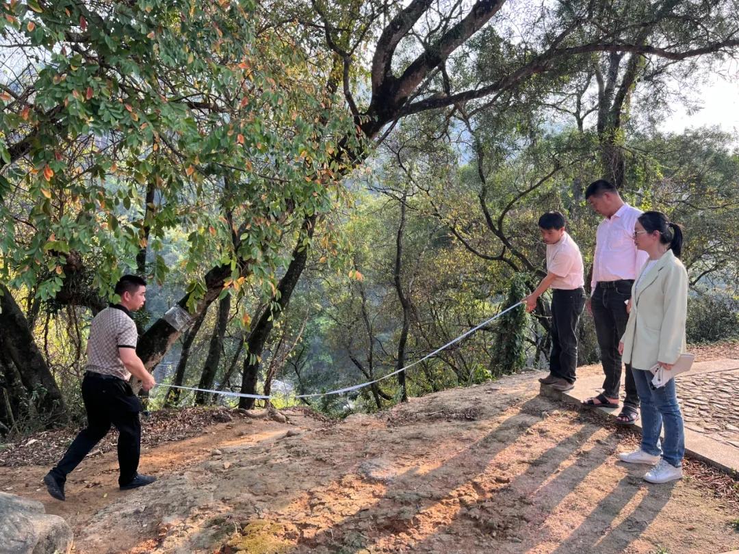 圖為市紀委監委下派至美亭村第一書記黃華容與村干部、村民一起測量擬建興仁灣停車場配套休息亭四至范圍及面積(顏曉楓 攝)